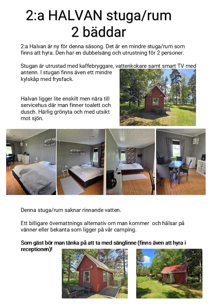 - 1 Stuga/rum med 2 bäddar. Läs mer om ”2:a Halvan” här!